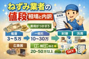 ねずみ業者の値段って、調べれば調べるほどバラつきがあって不安になりますよね。あなたが知りたいのは、ねずみ駆除費用の相場や料金の目安だけじゃなくて、見積もりの内訳が妥当か、侵入口封鎖や消毒がどこまで入るのか、保証は付くのか、悪徳業者の高額請求をどう避けるか…このあたりかなと思います。