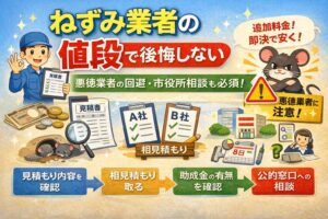 あなたが安心したいのは「いくらか」だけじゃなくて、「その金額で何をやってくれるか」だと思います。なので、合計だけで判断せず、作業範囲(駆除・封鎖・清掃消毒・点検回数・保証)を同条件にそろえて比較すると、納得感が一気に上がりますよ。