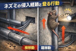侵入経路は大きく分けて、壁際や梁を伝う横移動と、配管・柱・ケーブル類を伝う縦移動があります。検索でよく出る「ネズミは壁を登る?」「配管を登る?」はまさに縦移動の話で、ねずみ返しが活きる場面が多いです。逆に、室内の棚の上や天井裏での横移動は、ねずみ返しだけで止めにくいことがあるので、塞ぐ系(防鼠ブラシや金網など)とセットで考えるのが現実的です。