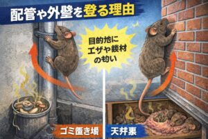 「ネズミが配管を登る」「ネズミが壁を登る」って、映像で見るとびっくりしますよね。でも、ネズミにとって登ること自体は目的じゃなくて、目的地に行くための手段なんです。目的地って何かというと、だいたいエサがある場所か安全な通路(天井裏・壁の中)です。