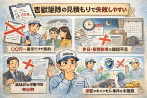 害獣駆除は現場で金額が変わりやすいので、合計だけで判断すると後悔しがちです。作業範囲・追加料金条件・保証の有無まで書面で確認して、納得してから進めるのが安心ですよ。