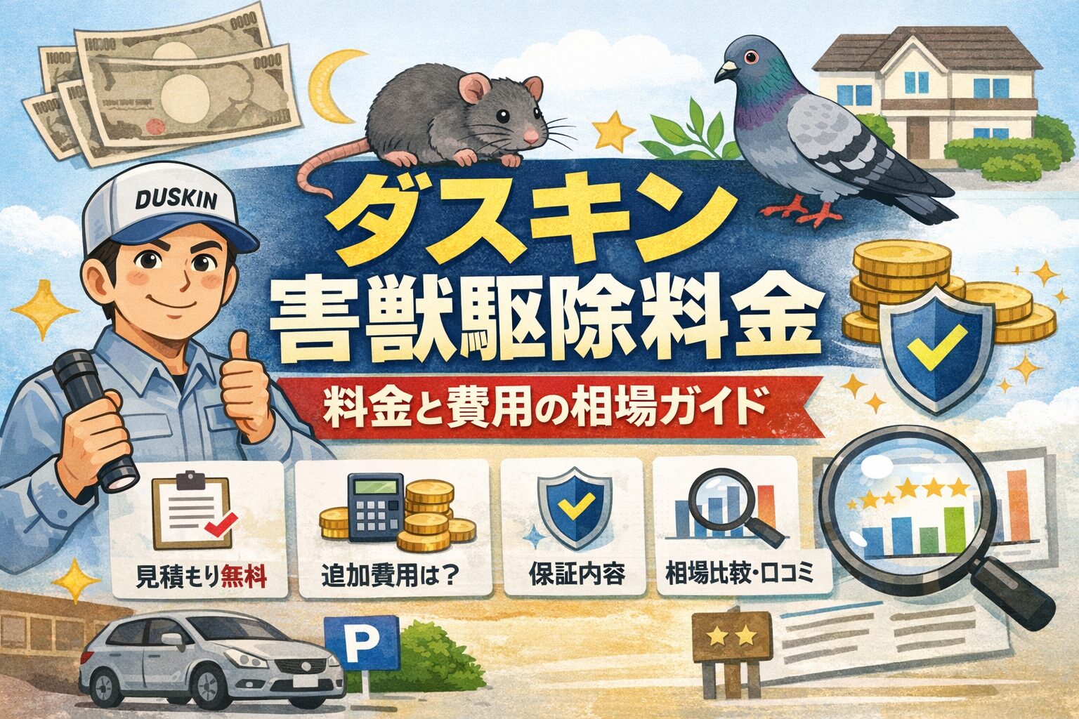 この記事では、ダスキン害獣駆除料金の考え方を、ネズミ駆除の料金例や鳩対策の料金体系、出張費の扱い、夜間休日割増、保証までまとめて、見積もり比較で損しにくい形に整理します。害獣駆除110番などの相場比較も入れつつ、最後は納得して選べるところまで一緒に進めますよ。