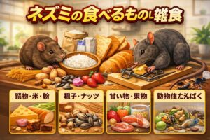 ネズミの食べるものは雑食で、家の中では米・粉もの・ペットフード・生ゴミなどが特に狙われやすいです。種類で傾向はありますが、最優先すべきは餌を断つことです。