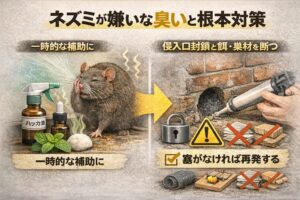 ネズミが嫌いな臭いは補助的な手段です。侵入口封鎖と餌管理がなければ、再発しやすいのが現実です。