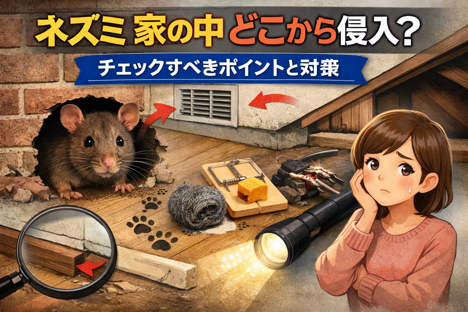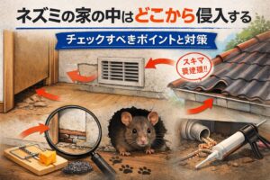 ネズミの家の中はどこから入るのか、その答えは「家中の小さな隙間」です。侵入口を見つけて塞ぎ、エサと巣材を減らすことで、再発リスクは大きく下げられます。
